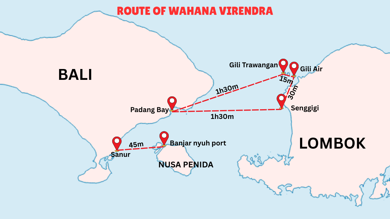 Wahana Virendra has daily route starting from Padang Bai harbor at east part of Bali, which is the closest way that connecting between Bali and Gili Trawangan, Gili Air and Lombok. The route of Wahana Virendra start from Padang Bai Bali and going straightly to Gili Trawangan, and then to Gili Air, after that to Senggigi Lombok. and the last back to Padang Bai Bali straightly. This route and schedule may changed at any time depending on the weather and season.